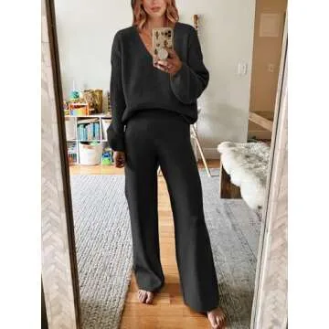 Caracilia Lounge Sets for Women Two Piece Outfits Fall Knit Matching Lounge Wear Jogger Sweater Sets 2023 Winter Casual V Neck Sweat Suit Tracksuit Travel Comfy Cozy Trendy Clothes B1165heise-S Black