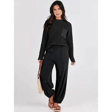 Show more Introducing the Caracilia Women's Two Piece Outfits Fashion Lounge Set - a perfect blend of style, comfort, and functionality designed for today's modern woman. This exquisite set includes a cozy long-sleeve pullover sweater and matching jogger pants, crafted from luxurious warm knit fabric that ensures you stay snug during the chilly autumn and winter seasons. Available in a stunning black color, this outfit effortlessly caters to fashion-forward individuals who appreciate both elegance and comfort.