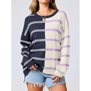 Show more Introducing the Caracilia Women’s Striped Sweater, the perfect blend of style, comfort, and versatility for your 2024 fall wardrobe. This oversized pullover features a chic color block design in classic navy blue and apricot hues, ensuring you stand out effortlessly while enjoying the cozy embrace of its ultra-soft fabric. Crafted from a premium blend of 50% viscose, 30% nylon, and 20% PBT, this sweater offers exceptional breathability and stretch, allowing for all-day comfort whether you’re at home, at the office, or out on the town. Available in sizes ranging from S (US 4-6) to XL (US 16-18), there’s a perfect fit for everyone.
