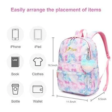 Show more Introducing the Caran·Y Waterproof Girls School Backpack, a perfect blend of style, functionality, and durability designed for kids aged 6-18. With its unique love and starry sky design, this backpack not only stands out but also provides ample space to keep your essentials organized. The maximum extension size is 16.5" x 11.6" x 5.5" (42CM x 30CM x 14CM), ensuring it is lightweight and easy to carry without compromising on storage capacity. This thoughtful design includes additional bags in the front and back, making it easier to fit wallets, laptops, snacks, and cosmetics securely. Explore the versatility and elegance of this exquisite backpack, crafted with care by our Caran·Y brand designer and exclusively available on Amazon.
