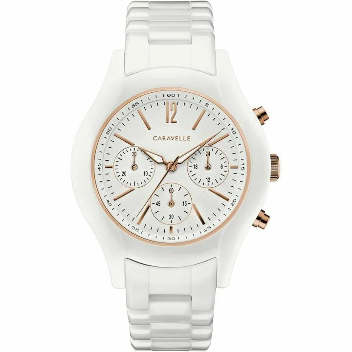 Show moreExperience elegance and precision with the Caravelle by Bulova Ladies' Sport Chronograph Quartz Two-Tone Ceramic Watch, featuring a pristine white dial and the exquisite design detail that Bulova is celebrated for. Blending sporty functionality with sophisticated aesthetics, this timepiece is a must-have for any watch enthusiast. It offers a durable two-tone ceramic band that's both stylish and resilient, providing a modern contrast against the classic white and rose gold accents. This Caravelle watch is part of the esteemed Bulova family, ensuring top-notch craftsmanship and reliability.