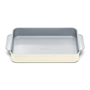 Show more Transform your kitchen experience with the Caraway Non-Stick Ceramic 9”x13” Rectangle Pan, a stunning blend of elegance and practicality. This beautifully crafted baking pan isn’t just another kitchen accessory—it’s a statement piece that elevates your culinary creations. With a vibrant cream color and a design that integrates seamlessly into any kitchen décor, this pan promises to turn both cooking and serving into delightful experiences. Designed with a non-toxic ceramic coating, it assures you a healthier approach to baking, free from harmful chemicals typically found in traditional pans. Forget about the reservations that come with baking; with Caraway, you can focus on creating delicious meals for your loved ones.