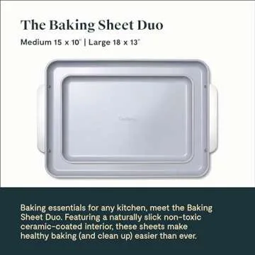 ... Show more Experience the joy of baking with the exceptional Baking Sheet Duo by Caraway, designed to revolutionize your culinary endeavors. This set includes two sizes: the 18x13 inch Large and the 15x10 inch Medium baking sheets, expertly crafted to ensure convenience and versatility in any kitchen. Each sheet boasts a naturally slick, non-toxic ceramic-coated interior, allowing for easy baking and minimal cleanup—making healthy cooking a breeze.