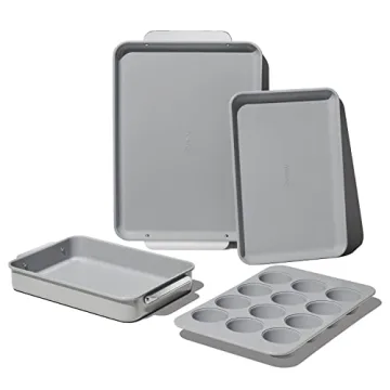 Show moreIntroducing the Caraway Nonstick Ceramic Bakeware Set, a stunning addition to any kitchen that not only enhances your baking experience but also elevates your kitchen decor. This beautifully designed, consciously crafted set brings together a collection of five essential pieces: an 18x13" baking sheet, a 10x15" baking sheet, a 12-cup muffin pan, a 9x13" rectangle pan, and a dedicated storage organizer, ensuring that you have everything you need for your baking adventures. With its elegant gray color, this bakeware set is not just about functionality; it's about style and simplicity, inviting you to create delightful dishes with confidence.