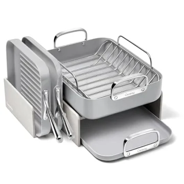 Show moreThe Caraway Square Cookware Set is the quintessential addition to any modern kitchen, embodying both elegance and functionality. Designed with a sleek gray finish that complements any decor, this cookware set is perfect for diverse cooking techniques. Featuring spacious pans ideal for griddling, toasting, searing, roasting, and more, this collection allows for culinary creativity without compromising your health. Made with a proprietary non-toxic ceramic coating, Caraway ensures that you can enjoy delicious meals knowing you're avoiding harmful chemicals like PFOA, PTFE, lead, and cadmium. The set includes an 11” Square Griddle Pan, an 11” Square Grill Pan, a 19x12" Double Burner Griddle, and a 16x13" Roasting Pan & Wire Rack, providing you with everything you need for both everyday cooking and special occasions.