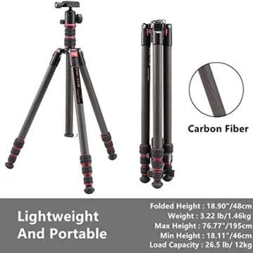 Show moreWelcome to a new era of stability and versatility in photography and videography with the DMIDITIR 76 inch Carbon Fiber Tripod. Expertly designed to elevate your visual captures, this camera tripod monopod combo caters proficiently to all your shooting needs. Its sleek carbon fiber construction not only contributes to its lightweight nature but also enhances strength, ensuring it can handle up to 26.5 pounds of equipment effortlessly. The allure of its carbon fiber design offers an elegant aesthetic in a dark gray finish accented with silver trim, making it a stylish addition to your gear.