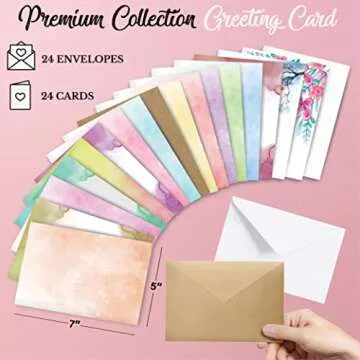 This comprehensive DIY set contains everything you’ll need, including 24 premium blank 5" by 7" cards and matching envelopes that provide the ideal canvas for your expressions. But it doesn’t stop there! Our kit features: