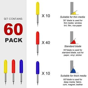 Show moreIntroducing the CAREGY 60 PCS Replacement Cutting Blades set, a must-have for any crafting enthusiast or DIY professional seeking precision cutting tools. This comprehensive collection includes an impressive assortment of 60 replacement blades, designed to cater to a variety of media and project types. The set features 10 PCS of 30 degree fine point cutting blades (distinguished by their yellow caps), 40 PCS of 45 degree standard blades (marked with red caps), and 10 PCS of 60 degree deep cut blades (identified by blue caps). Each blade is engineered with the utmost care to ensure optimal performance, allowing you to tackle any cutting task with confidence.