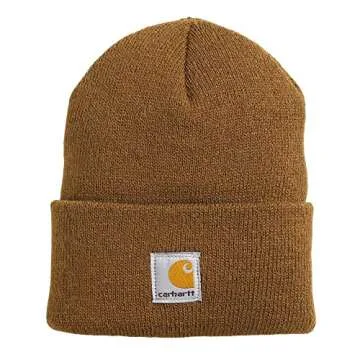 Stretchable rib knit hat with a Carhartt brandmark label on front.