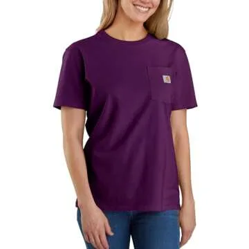 Show moreIntroducing the Carhartt Women's Loose Fit Heavyweight Short-Sleeve Pocket T-Shirt in rich Eggplant—the perfect fusion of style, durability, and comfort. Designed for the modern woman who appreciates quality and practicality, this t-shirt features a classic rib-knit crewneck that offers a structured fit while ensuring ease of movement. The side-seamed construction is specifically engineered to minimize twisting, enabling you to maintain a polished look throughout your daily activities. With a handy left-chest pocket adorned with the iconic sewn-on Carhartt label, you not only have a stylish element but also functional storage for essentials.