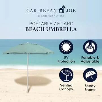 Show moreIntroducing the CARIBBEAN JOE Chaby International Portable, Adjustable Tilt Beach Umbrella, your perfect companion for all your outdoor adventures! Measuring an impressive 7 feet, this umbrella is designed to provide the ultimate sun protection whenever you need it. Crafted with a lightweight yet durable steel frame and a colorful mint polyester cover, it not only looks great but also offers superior UV protection against harmful rays, allowing you to fully relax whether you're at the beach, on a picnic, or enjoying your backyard. The umbrella features an easy-to-use adjustable tilt mechanism, enabling you to shift its angle with the sun throughout the day for optimal shade.