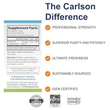 Carlson - Kid's Super Daily D3, Kids Vitamin D Drops, 400 IU (10 mcg) per Drop, Heart & Immune Health, Vegetarian, Liquid Vitamin D Drops, Unflavored, 365 Drops