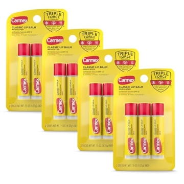 Show moreIndulge your lips with the ultimate in lip care! Carmex Classic Medicated Lip Balm Sticks are the go-to choice for anyone suffering from dry, chapped lips. This product features a generous total of 12 tubes grouped in four convenient packs of three, delivering hydration on-the-go. Whether you're navigating through frigid winter air or blazing summer sunshine, these medicated lip balms have your back. Formulated with an array of powerful ingredients such as cocoa butter, camphor, and menthol, they glide on effortlessly, providing an immediate soothing and cooling sensation that transforms your dry lips into a picture of health and comfort.
