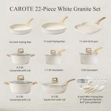 CAROTE 22pcs Pots and Pans Set Nonstick, Cookware Set White Granite Induction Kitchen Cooking Set w/Frying Pans & Saucepans& Grill Pan(PFOS, PFOA Free)