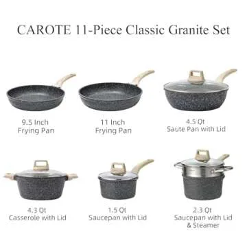 Show more Introducing the Eco-friendly Classic Granite 11-Piece Cookware Set by CAROTE, where safety meets elegance in your kitchen. Crafted from non-stick granite material, this stunning cookware guarantees PFOS and PFOA-free cooking, ensuring each meal is as healthy as it is delicious. With this set, you will find everything you need for daily cooking, including two versatile fry pans, a saucepan with a lid and steamer, a casserole with a lid, and a sauté pan with a lid.