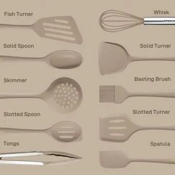 - Essential Kitchen Set: The set includes all the necessary tools: a solid turner, slotted turner, fish turner, solid spoon, slotted spoon, basting brush, skimmer, spatula, tongs, and a whisk, making it perfect for a variety of cooking tasks.