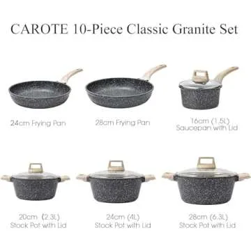 Show more Introducing the Eco-friendly Classic Granite Cookware Set by CAROTE - your ultimate kitchen companion for wholesome, healthier cooking experiences! Crafted from non-stick granite material, this set is perfect for every home chef who prioritizes safety and sustainability. Free from harmful PFOS and PFOA chemicals, you can enjoy peace of mind with every meal made. This comprehensive 8-piece cookware set includes everything you need: a 9.5 inches frying skillet, an 11 inches frying skillet, a 4.3 quarts casserole pot with lid, a 1.8 quarts saucepan with lid, and a 4.5QT sauté pan with lid. Whether you're flipping pancakes or simmering sauces, this versatile assortment caters to various cooking methods and styles.