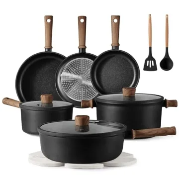 Enjoy the luxury of even and rapid heat distribution without hot spots, ensuring that your culinary creations are cooked to perfection every time. The thoughtfully designed cookware not only boasts functionality but also a stunning appearance—elegant silicone handles mimic the look of wood, adding a touch of sophistication to your kitchen. The set also simplifies storage, with interchangeable lids that fit multiple pans, reducing clutter and streamlining your cooking experience.