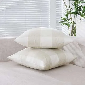 Show more Transform your home decor with these stunning Beige Cream White Buffalo Check Pillow Covers, expertly crafted from a durable polyester and linen blend. While they may not be exceptionally soft, they are designed with a gorgeous farmhouse aesthetic that resonates with classic charm. Perfect for both indoor and outdoor use, these pillow covers effortlessly bring a touch of elegance to your living room, bedroom, patio, or porch swing. Measuring at a convenient 18 x 18 inches, they serve as a versatile accessory that can be mixed and matched with other decor styles, adding a unique flair to your space.