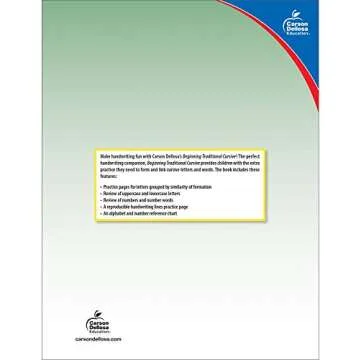 Show more Introduce your child to the beautiful art of cursive writing with the Carson Dellosa Beginning Traditional Cursive Handwriting Workbook. This meticulously designed workbook is perfect for children in grades 1 to 3, providing an engaging and friendly environment for early learners to get hands-on practice. Sold as 1 Each, it is packed with everything your young writer needs to master cursive letters and words. Each page features clear instructions, colorful illustrations, and motivating exercises that capture the excitement of learning.