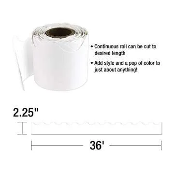 Show more Transform your classroom into an inviting learning environment with the Carson Dellosa White Bulletin Board Borders. These borders are designed to provide a modern, crisp aesthetic that enhances any educational space. Made from thick, flexible white paper, these decorative borders are not only durable but also incredibly versatile, making them perfect for a range of applications including bulletin boards, cork boards, and even locker decorations. Each roll measures an impressive 36 feet by 2.25 inches, providing plenty of material to create stunning displays tailored to your unique style.
