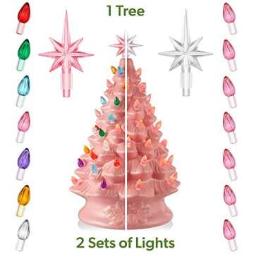 Casafield Hand Painted Ceramic Christmas Tree, Pink 15-Inch Pre-Lit Tree with 128 Multi Color Lights and 2 Star Toppers