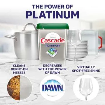 Show moreIntroducing the Cascade Platinum Plus ActionPacs Dishwasher Detergent Pods – where innovation meets efficiency in cleaning your dishes. Designed for the modern kitchen, each pod is a powerhouse that promises to tackle even the toughest burnt-on messes with absolute ease and no pre-wash required. Featuring the remarkable grease-fighting power of Dawn, these 14-count pods dissolve quickly in your dishwasher, unleashing a torrent of cleaning enzymes that break down food particles into tiny sizes, ensuring they wash away effortlessly. The result? Sparkling clean, virtually spot-free dishes after every wash.