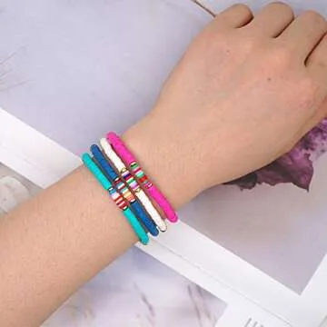 Show more Introducing the CASDAN 14 PCS Heishi Bracelet Set, a vibrant collection of surfer-inspired jewelry that beautifully captures the essence of summertime bliss. Each bracelet is exquisitely handcrafted using high-quality polymer clay vinyl discs, showcasing a stunning array of colors that can easily elevate any outfit. With their unique stretch cord design, these bracelets slip on and off effortlessly, making them the perfect accessory for those who are always on the go. The versatility of this set allows you to mix and match, stack or wear them individually according to your mood and style, ensuring there's never a dull moment with your look.