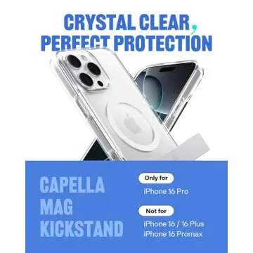 Show more The **Caseology Capella Mag Kickstand for iPhone 16 Pro** is the ultimate protective accessory designed specially for your device. This case combines form and functionality, boasting an integrated magnetic ring that is fully compatible with MagSafe chargers. Its innovative design not only secures your phone but also makes sure it remains perfectly aligned while charging. One of its standout features is the kickstand capability, allowing for hands-free media viewing anytime, anywhere. Made from ultra-clear TPU with advanced anti-yellowing technology, this case retains its crystal-clear appearance over time while providing a protective shield for your device.