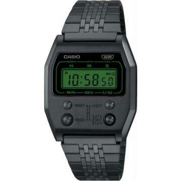 The Casio A1100 Series Digital Wristwatch offers a nostalgic charm with its vintage design, making it the perfect accessory for both men and women. This unisex model, available in black with a green digital display, is a stylish nod to the retro designs of the past. The A1100B-1 is part of Casio’s Vintage Collection and embodies a timeless appeal that effortlessly blends old-school aesthetics with modern functionality. With its sleek and compact design, this wristwatch is suitable for any wrist size and...