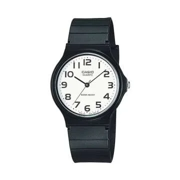 Show more Discover the perfect blend of simplicity and reliability with the Casio Men's MQ24-7B2 Analog Watch. This round watch features a clean, logoed white dial, paired beautifully with Arabic numeral markers that ensure effortless reading. The watch is crafted with a robust 35 mm plastic case, topped with a protective resin glass dial window, making it both stylish and durable. With its quartz movement and classic analog display, it guarantees precise timekeeping, essential for the modern individual.