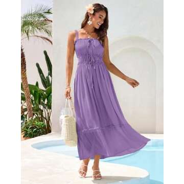 Show moreThe Casual Summer Dress for Women Smocked Tiered Boho Flowy Maxi Dress in a stunning Purple S is the epitome of effortless summer style. Made from high-quality, soft, and lightweight polyester, this dress is as cool as it is comfortable, making it ideal for those hot summer days. Its elegant A-line silhouette features adjustable spaghetti straps and an elastic high waist for a perfect fit that flatters a variety of body types. With a flowy skirt that drapes beautifully to ankle length, this dress exudes femininity and grace.