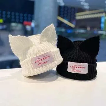 Cat Ear Hat Cute Beanie Hat Knit Wool Cap Warm Slouchy Crochet Hat (Black)