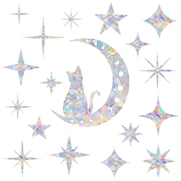 Show more Transform your living spaces with the enchanting Cat Moon and 18 Pieces Star Window Clings! These delightful anti-collision window decals are designed not only to enhance the beauty of your windows but also to protect birds from collisions. Made from non-adhesive, high-quality prismatic vinyl, these clings are easy to apply and remove without leaving a sticky residue. Each pack contains a stunning array of colorful stars, ranging from 2.2" to 4.5" across, and a charming 5.7" cat moon, perfect for spreading joy and safety throughout your home.