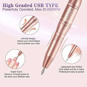 Show more Discover the ultimate solution for achieving salon-quality nails in the comfort of your own home with the Professional Nail Drill from a leading beauty brand. This remarkable nail drill comes equipped with 6 multifunctional drill bits designed for grinding, carving, cutting, polishing, and effortlessly removing gel polish and cuticles. Perfect for both acrylic nails and natural nails, it caters to all nail enthusiasts who strive for perfection.