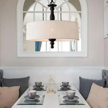 With an overall height of 19 inches and an adjustable hanging chain that can reach up to 59 inches, this chandelier easily adapts to various ceiling heights, making it suitable for any size room. Made with high-quality materials, including a durable black finish metal frame and a handcrafted linen shade, it exudes an air of sophistication and elegance. The versatility of this design ensures it seamlessly complements different interior styles—whether your taste leans towards farmhouse, industrial, or contemporary, this chandelier fits perfectly.