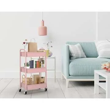 CAXXA 3-Tier Rolling Metal Storage Organizer - Mobile Utility Cart with Caster Wheels, Pink