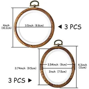 Show moreIntroducing the Caydo 6 Pieces 4 Inch Round and Oval Embroidery Hoop Display Frame, a must-have for every crafting enthusiast! Designed to elevate your artistic endeavors, these versatile embroidery hoops are made of high-quality rubber plastic, giving them both durability and a comforting retro aesthetic. Each hoop features a faux wood texture that adds a touch of elegance to your projects, making your handmade creations truly stand out. Whether you are sewing Christmas ornaments or displaying artwork, this set includes three round and three oval frames, ensuring you have the perfect shape to bring your vision to life. The unique hanging rings are crafted to enhance the look of your projects while ensuring they are securely displayed.