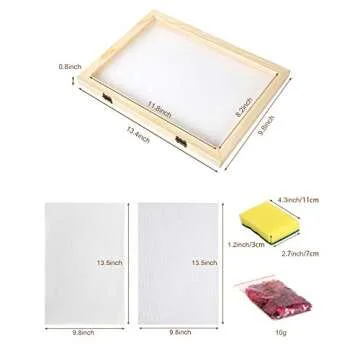 The kit includes everything you need to create stunning handmade paper. With two mesh pieces and two cloths included, your creative possibilities are endless. The inner screen size of 8.2 x 11.8 inches ensures you can craft papers of various sizes, while the 0.8-inch thickness of the frame provides durability during the paper-making process. The non-elastic yarn allows for a gentle crafting experience, making it essential to avoid applying too much pressure as you press your creation.
