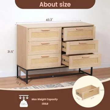 Show moreCCF Rattan Dresser redefines your living space with its exquisite blend of functionality and Bohemian style. Perfectly constructed for both aesthetic appeal and practical use, this 6-drawer dresser serves as a vibrant centerpiece for your bedroom, entryway, or living room. Made from sturdy wood-colored panels with natural rattan accents, this dresser not only whispers luxury but also offers a substantial amount of storage to help maintain a tidy environment, making it ideal for homes with children or those needing extra space for essentials.