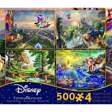 Show more Embark on a captivating journey through the enchanting world of Disney with the Ceaco 4 in 1 Multipack, featuring the Thomas Kinkade Disney Dreams Collection. This exquisite set includes four 500-piece jigsaw puzzles showcasing your favorite Disney characters from timeless classics such as Aladdin, Winnie the Pooh, Beauty and the Beast, and The Little Mermaid. Each puzzle is intricately designed to evoke nostalgia, making it perfect for fans of all ages. The vibrant colors and detailed artwork elevate the puzzling experience, ensuring every piece fits beautifully into the bigger picture—a stunning masterpiece that you can treasure forever!