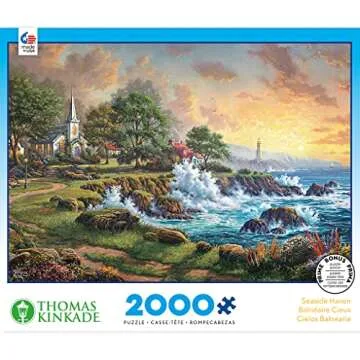 Show moreUnlock the beauty of tranquility with the **Ceaco Thomas Kinkade Seaside Haven Jigsaw Puzzle**. This exquisite 2000-piece puzzle invites you to piece together a captivating scene inspired by Thomas Kinkade’s beloved canvas artworks. Known for his incredible ability to infuse natural light into his paintings, Kinkade's Seaside Haven radiates calmness and serenity, making it a perfect escape from daily hustle and bustle. Measuring an impressive 38 x 26 inches when completed, this standard-sized jigsaw puzzle is not just a challenge for your mind, but a spectacle for your eyes. Proudly made in the USA, every piece embodies quality craftsmanship, bringing the beauty of Kinkade’s art into your home.