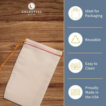 Show more Introducing the Celestial Gifts Muslin Bags, a luxurious collection of 100% premium-quality cotton drawstring bags designed to meet all your storage and gifting needs. Each bag is meticulously crafted in the USA, showcasing exceptional craftsmanship that stands apart in both quality and durability. Their soft texture makes these bags perfect for storing small items such as soaps, herbs, spices, and potpourri. With their versatile design, you can feel confident using them for any occasion, from everyday organization to special events.