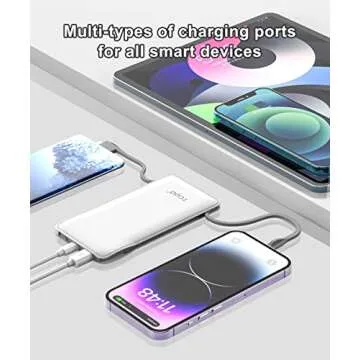 Show more This Multifunctional Portable Power Bank is your ultimate companion for staying charged on the go! Featuring a built-in USB-C charging cable, micro USB cable, and additional connectors, you can bid farewell to the hassle of carrying multiple cords. Designed for compatibility with a wide variety of devices, including the latest Apple iPhones and popular Android models, this power bank streamlines your life and keeps your devices powered up wherever you are.