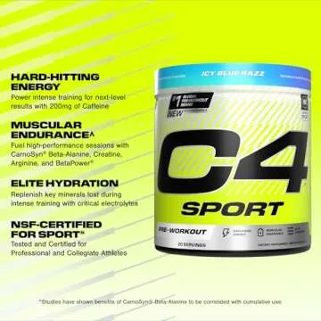 Show more The Cellucor C4 Sport Pre-Workout Supplement is the ultimate game changer for fitness enthusiasts and athletes alike. Engineered for maximum performance, this remarkable product boasts a powerful combination of 200mg of caffeine to deliver unmatched energy levels, allowing you to power through challenging workouts and push your limits. Say goodbye to muscular fatigue as this innovative formula incorporates clinically studied CarnoSyn Beta-Alanine to enhance muscular endurance and ensure you're ready for even the most demanding training sessions.