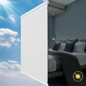 Show moreIntroducing our Cellular Shades Cordless Blackout Honeycomb Blinds, a premium addition to your home designed for ultimate comfort and style. These beautifully crafted fabric window shades in crisp white are not only functional but are also aesthetically pleasing, ensuring that they seamlessly blend with any decor. Measuring 31 inches wide by 64 inches high, these shades are perfect for various window sizes and configurations. The special blackout liner combined with honeycomb technology guarantees that you experience 100% light blockage and UV protection. Enjoy peace of mind knowing that harmful rays won't penetrate your living space, while also enhancing your home’s energy efficiency with superior insulation.
