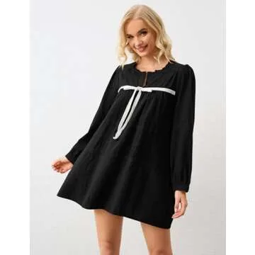 Show moreIntroducing the Ceputer Women’s Long Puff Sleeve Bow Tie Front Loose Cute Mini Dress - a beautiful blend of style, comfort, and effortless elegance. Made from a soft and lightweight cotton blend, this delightful dress is perfect for transitioning through the seasons, allowing you to embrace the warmth of spring and early summer, or enjoy cooler fall days. Featuring a bold and trendy square neckline, ruffled hem, and long puff sleeves that flutter gracefully, this dress is designed to make you feel sweet, lovely, and utterly charming. The exquisite lace accents and bow tie front add an element of sophistication while maintaining a casual vibe, making this piece a must-have in any wardrobe.