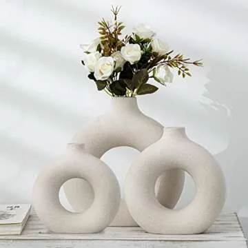 Ceramic Hollow Donut Vase Set of 3 for Pampas Grass | Neutral Modern Home Decor, Small Boho Minimalist Round White | Japandi Clay Beige Decorative for Bedroom, Living, Wedding, Office, Coffee Table