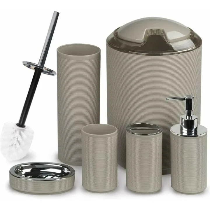 This 6-piece bathroom accessory set includes a soap dispenser, toothbrush holder, toothbrush cup, soap dish, garbage can, and toilet brush with holder. The set's beige color adds a touch of elegance, while its durable construction ensures longevity. The pieces are easy to clean and maintain, making them a practical addition to any bathroom. Moreover, the soap dispenser and toothbrush holder are specifically designed to provide convenience and keep your bathroom organized.