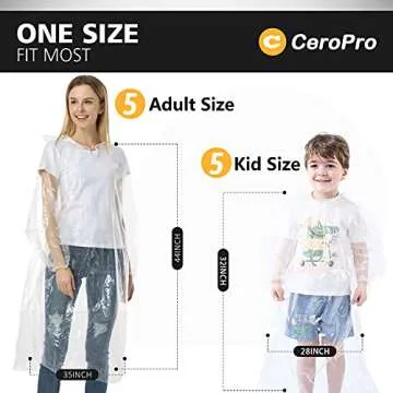 Show moreIntroducing the CeroPro Disposable Rain Ponchos Family Pack—the perfect solution for families seeking an effortless way to stay dry during unexpected downpours. This comprehensive 10-pack includes 5 adult ponchos and 5 kid-sized ponchos, all crafted from high-quality, eco-friendly PE material that is 100% waterproof and designed to withstand the rigors of outdoor adventures. At 60g and 0.35mm thick, these ponchos are nearly 50% thicker than typical options, ensuring durability you can count on no matter the weather. The upgraded design features elastic sleeves and full-length hoods, created specifically to prevent water from entering while providing ample coverage for both kids and adults, making them an ideal choice for your next Disney trip or any outdoor excursion.
